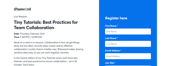 Nothing scares off a webinar prospect like a 20-field registration form. Of course, that doesn’t mean you have to scrap them altogether. As with pop-ups, your success is all in how you use them.