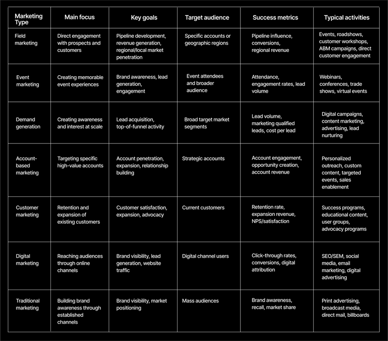 ➡️ The most effective B2B marketing strategies integrate all these disciplines, with field marketing serving as a bridge between broad marketing initiatives and specific sales opportunities.